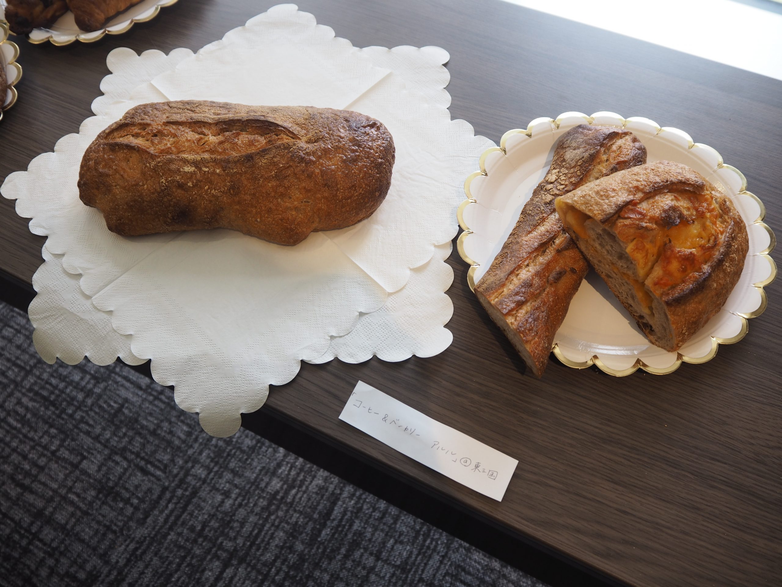 おまちかね、先ほど並べられていたパンの試食タイムがやってきました。東三国駅のショッピングプラザ内にある「ショッピングプラザコーヒー」の淹れたてコーヒーといっしょに味わいます。1つ目は「BLUE TREE FAVO」。大阪狭山市駅から徒歩10分ほどにある、パンとコーヒーのお店です。クロワッサンは層が美しく、参加者は惚れ惚れ。フランス産発酵バターが上品に香る至福のおいしさでした。
