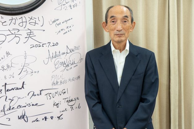 「TSUMUGI」の竹谷光司さん。「Happy Cooking」にサインを書き入れました。