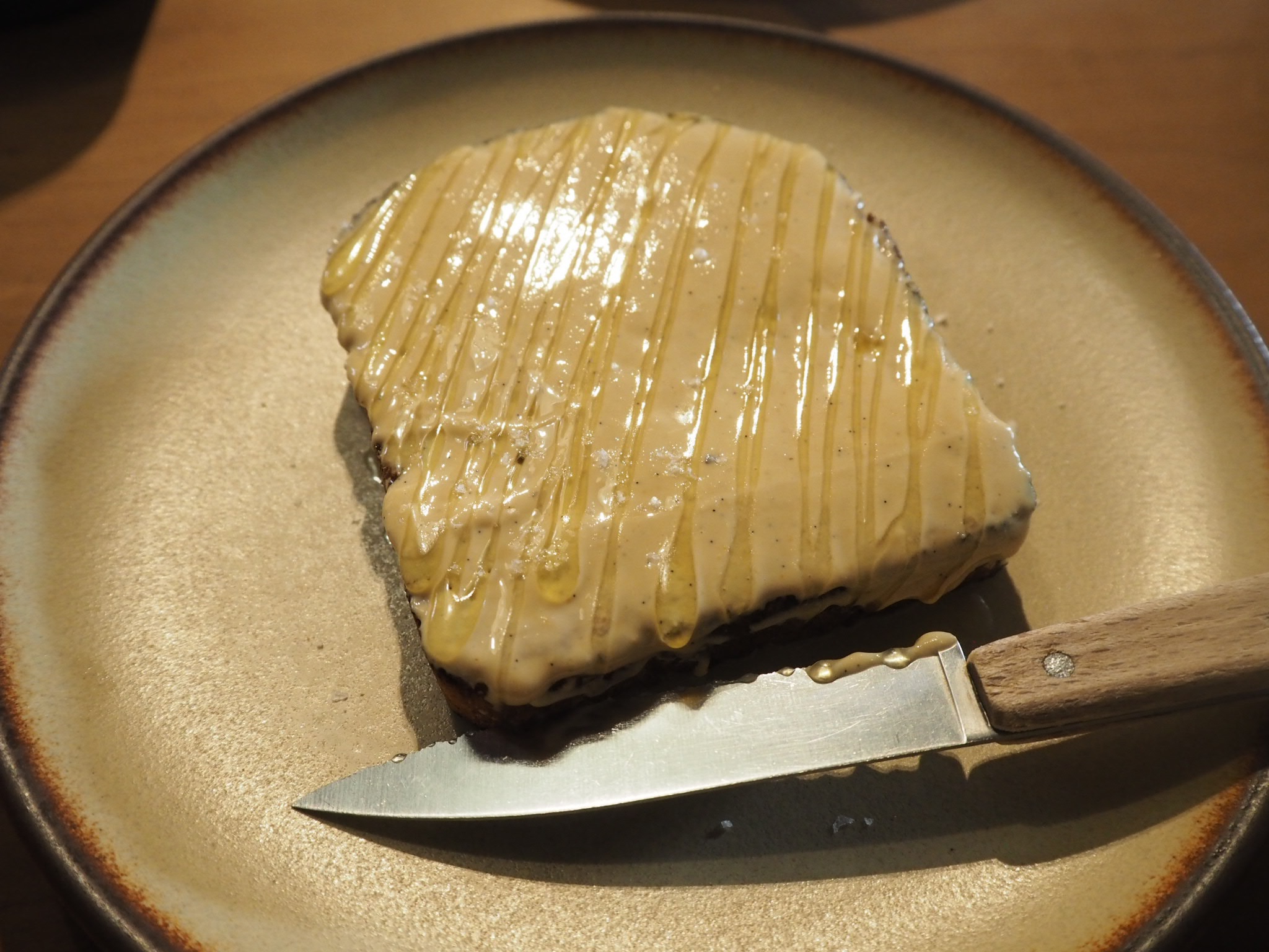 カントリーブレッドの表面にバニラカシューナッツバターがたっぷりと塗られていて、はちみつのようなものがかけられています。