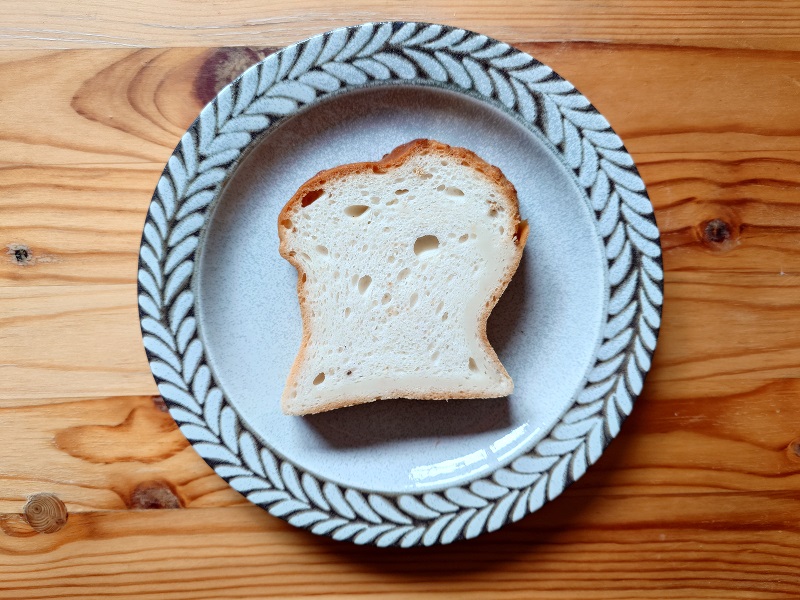 こちらはやや厚めにスライスし、ラベル記載通り約5分トーストしましたが、焼いたあともしっとり具合はそのまま!それに加えてもちもち食感を楽しむことができます。食パンはしっとり&もっちり食感が好み!という人にぜひおすすめしたい一品です。