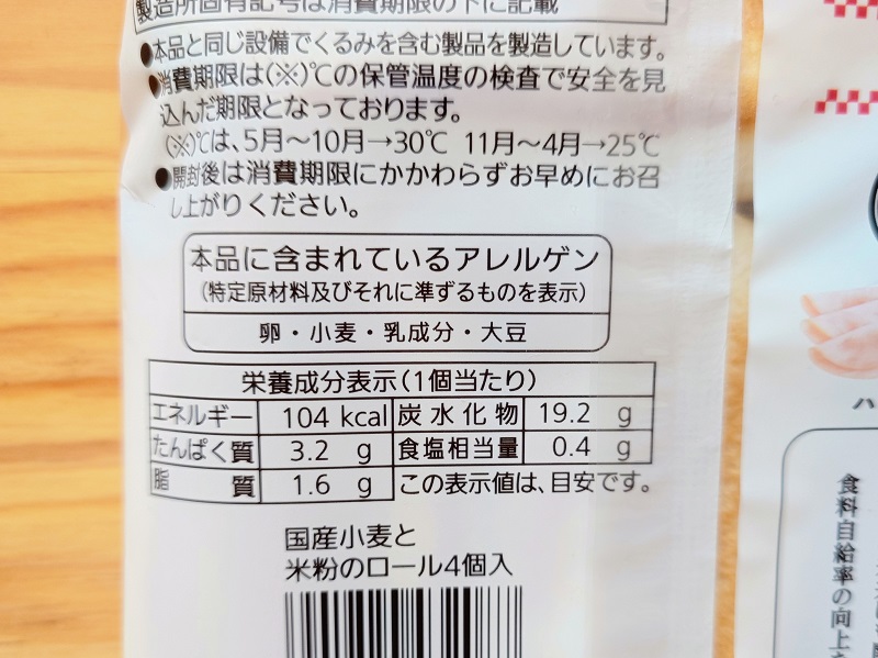第1位:104kcal「Pasco 国産小麦と米粉のロール 4個入」