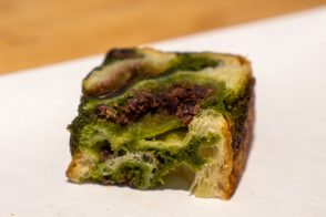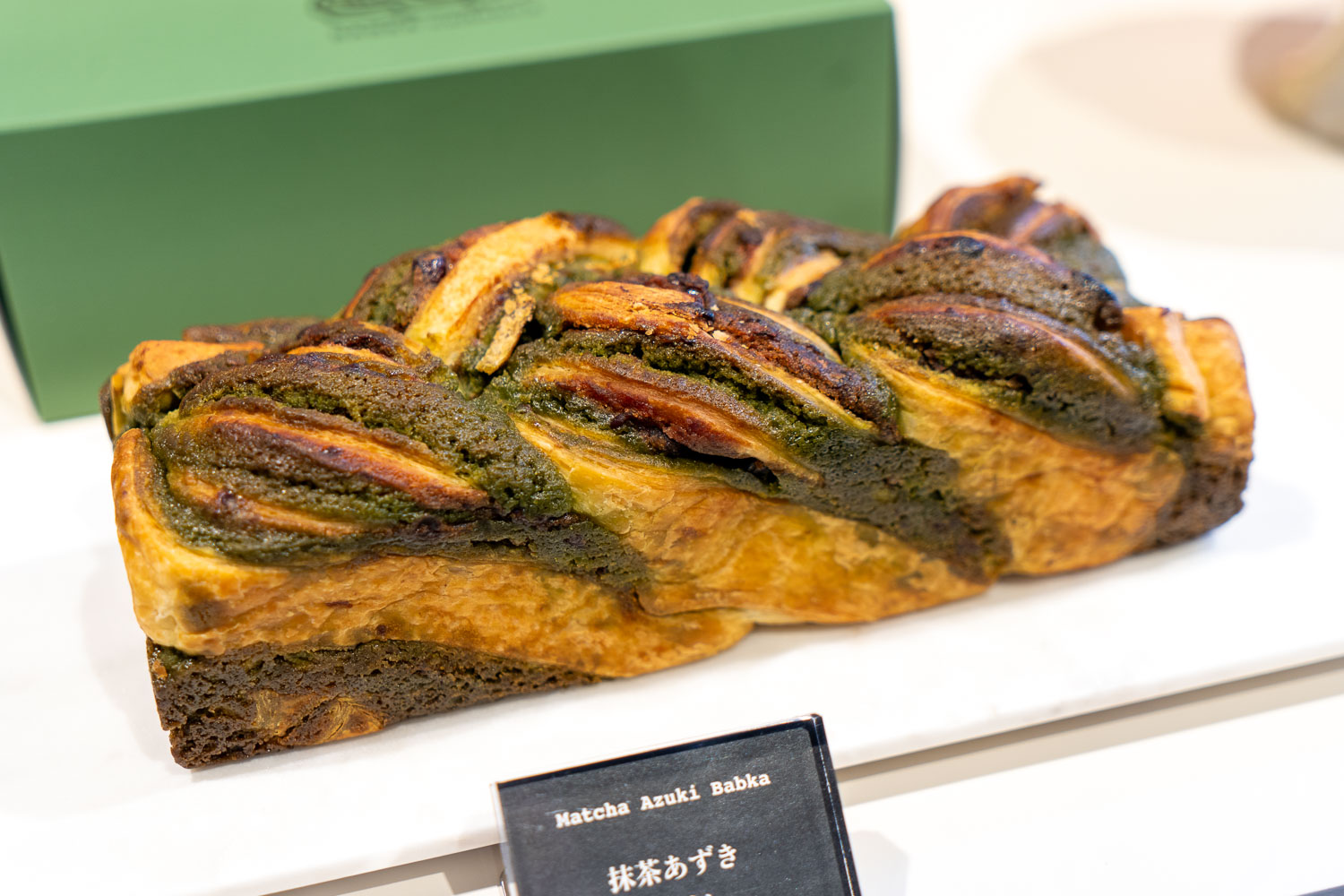 お店が京都にオープンすることもあって、「抹茶あずきバブカ」として和風なバブカも準備されました。抹茶とホワイトチョコレートを組み合わせたブラウニー生地と、北海道産あずきで作った粒あんを重ねて焼いています。抹茶とあずきという間違いのない組み合わせに、海外からの観光客にも人気が出そう。焼き上がったあと鮮やかな緑色になる抹茶を厳選して使用しています。