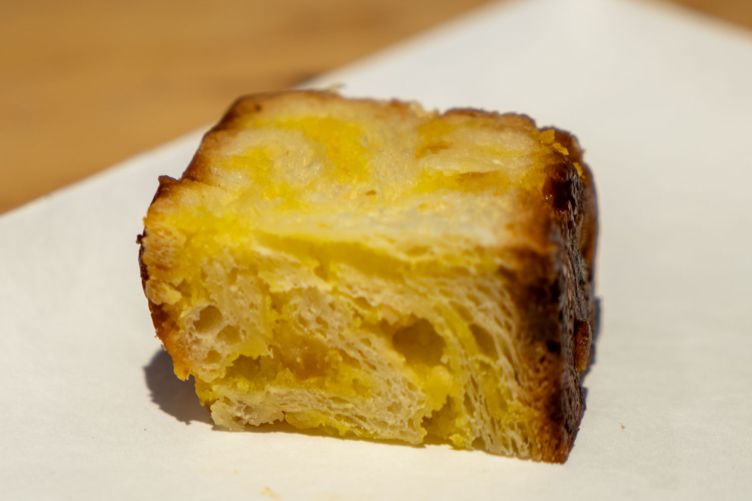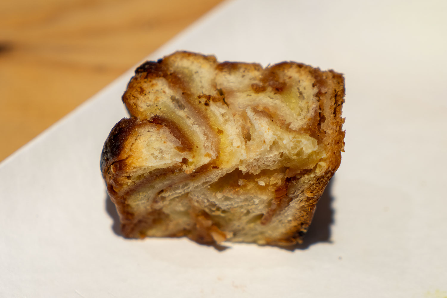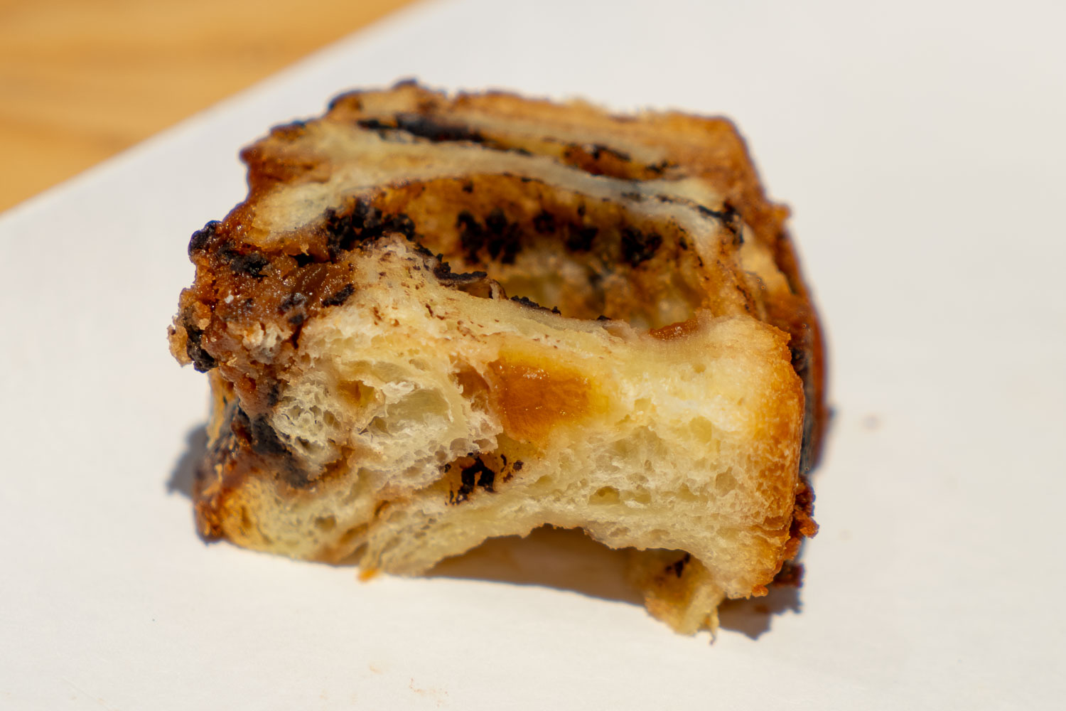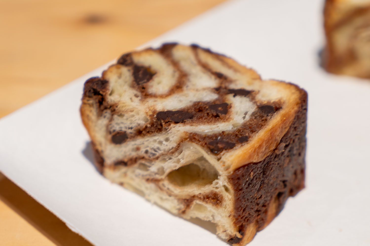 まずは「オリジナルバブカ」。バブカといえばチョコレート味が定番です。「バブカカダブラ」では、ブラウニーの生地とデニッシュ生地を何層にも重ね、さらに砕いたチョコレートをたっぷり散りばめて焼き上げています。しっかりと重みのある焼き上がりです。軽くトーストすると、表面のサクッと感が増します。